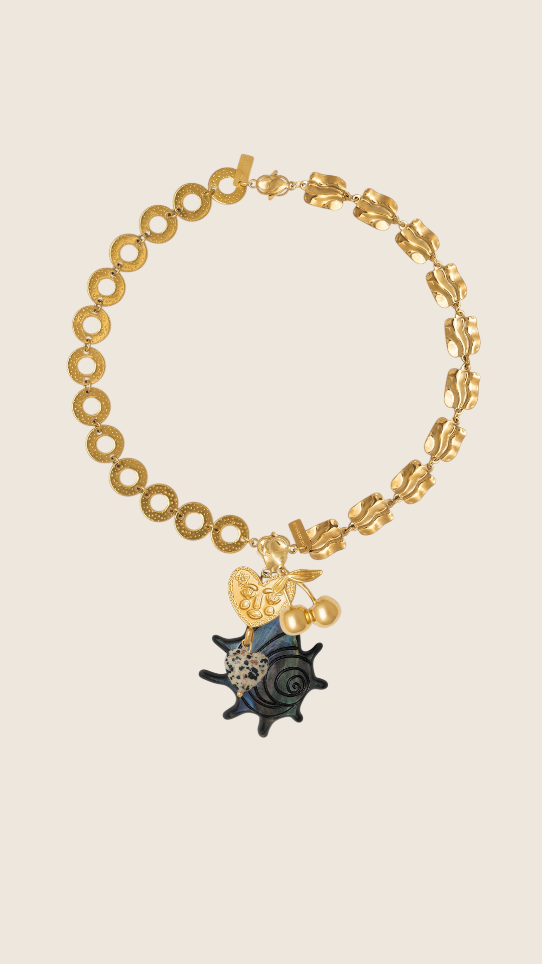 - Materiales: Acero inoxidable chapado en oro 18k, resina.