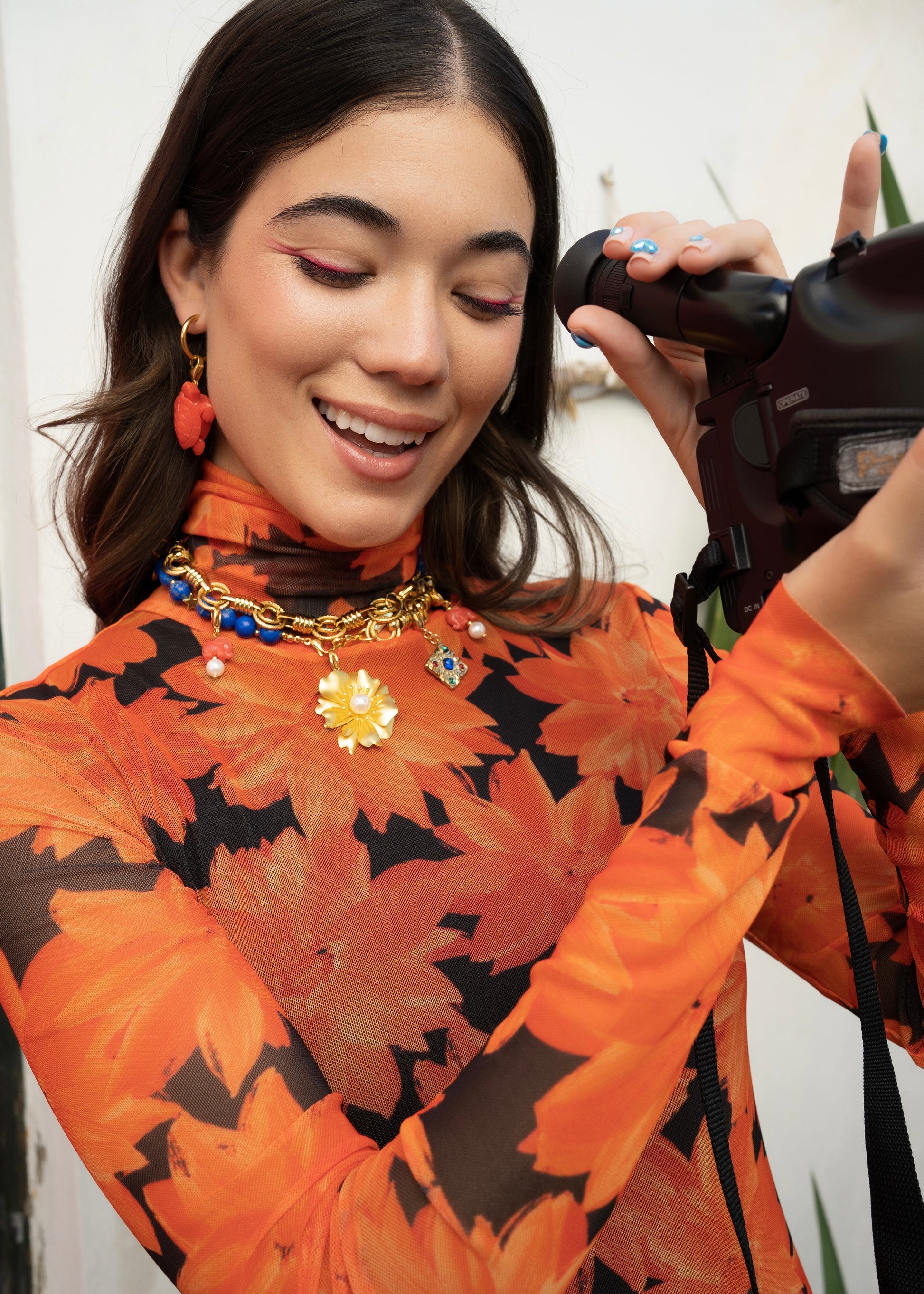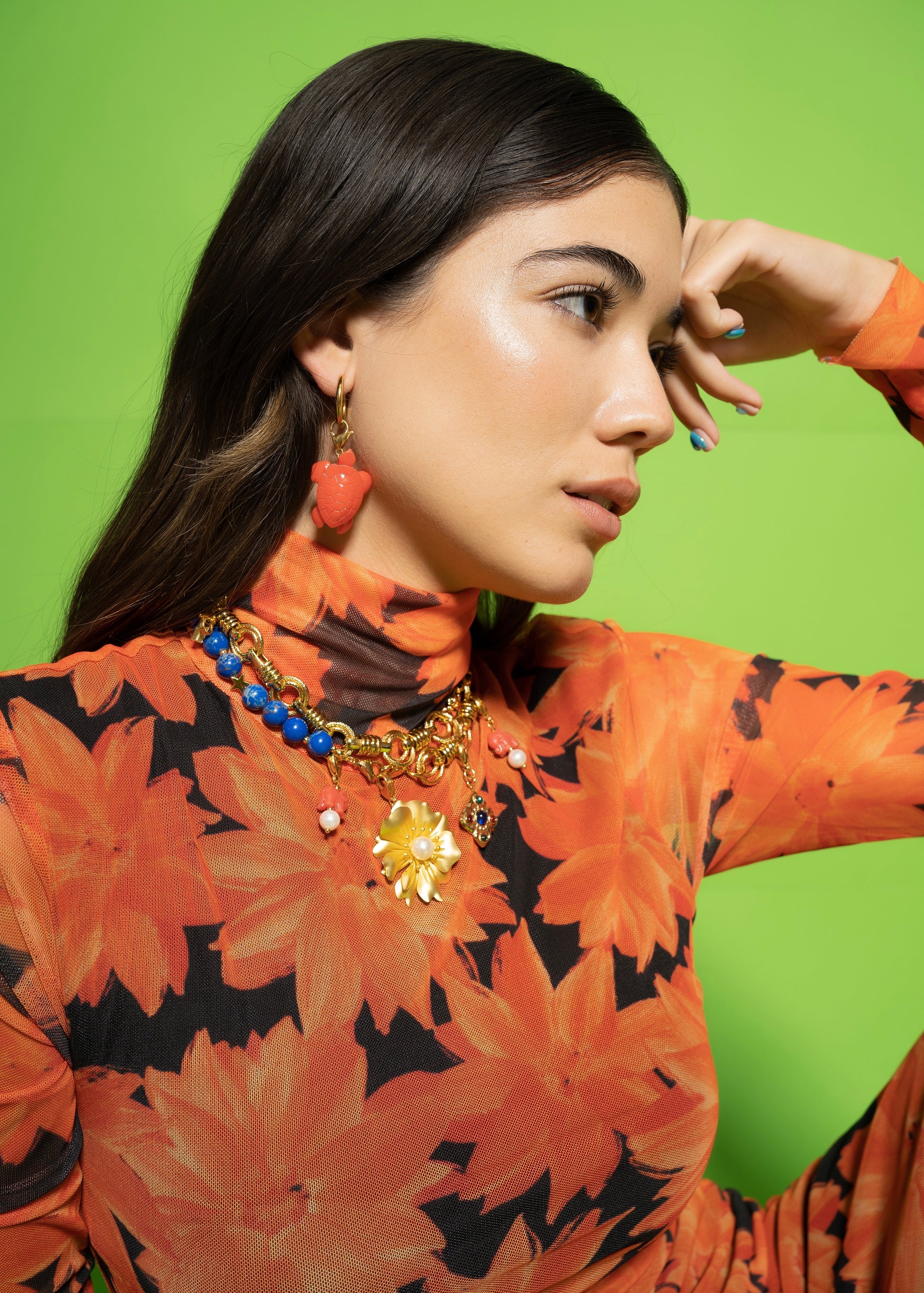 - Materiales: resina, perla natural de agua dulce, acero inoxidable chapado en oro 18k.