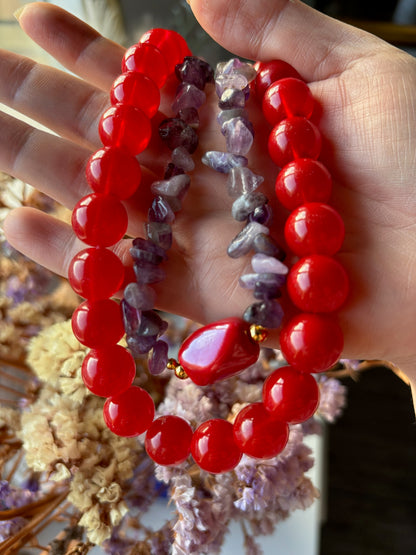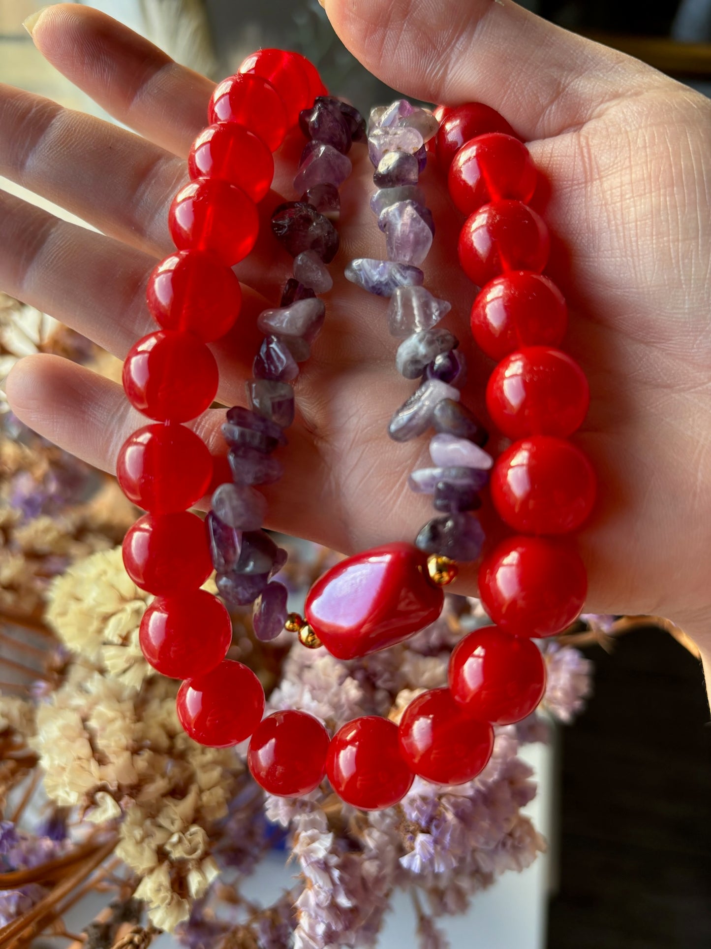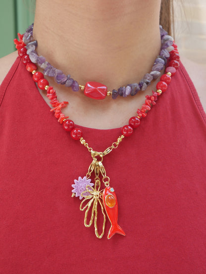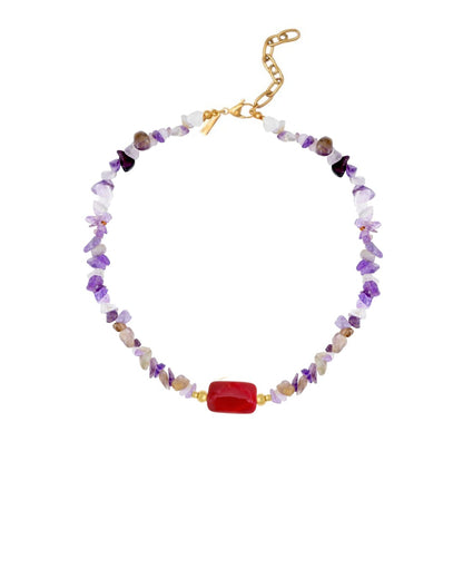 - Materiales: piedra amatista, cerámica y acero inoxidable chapado en oro 18k.