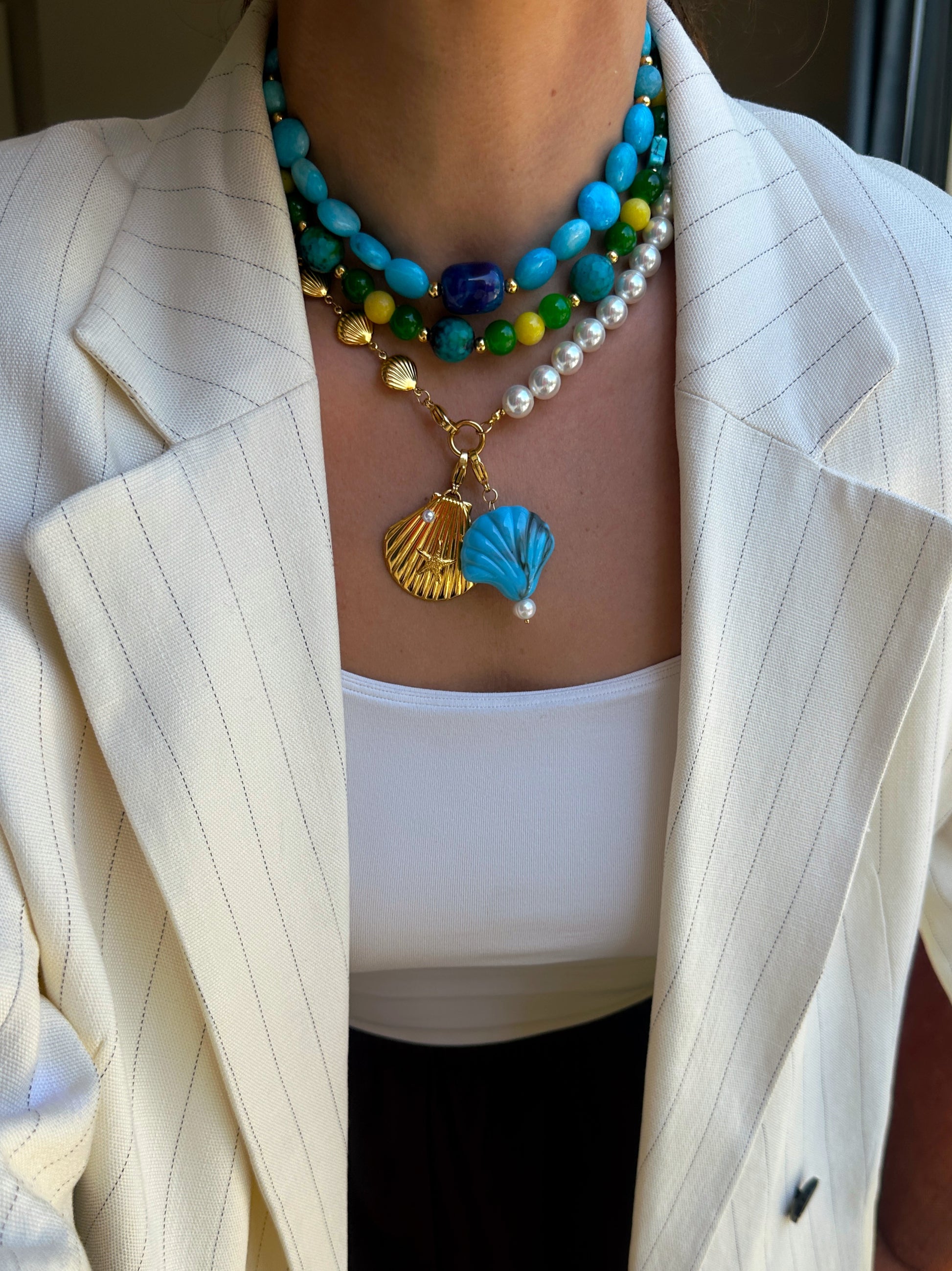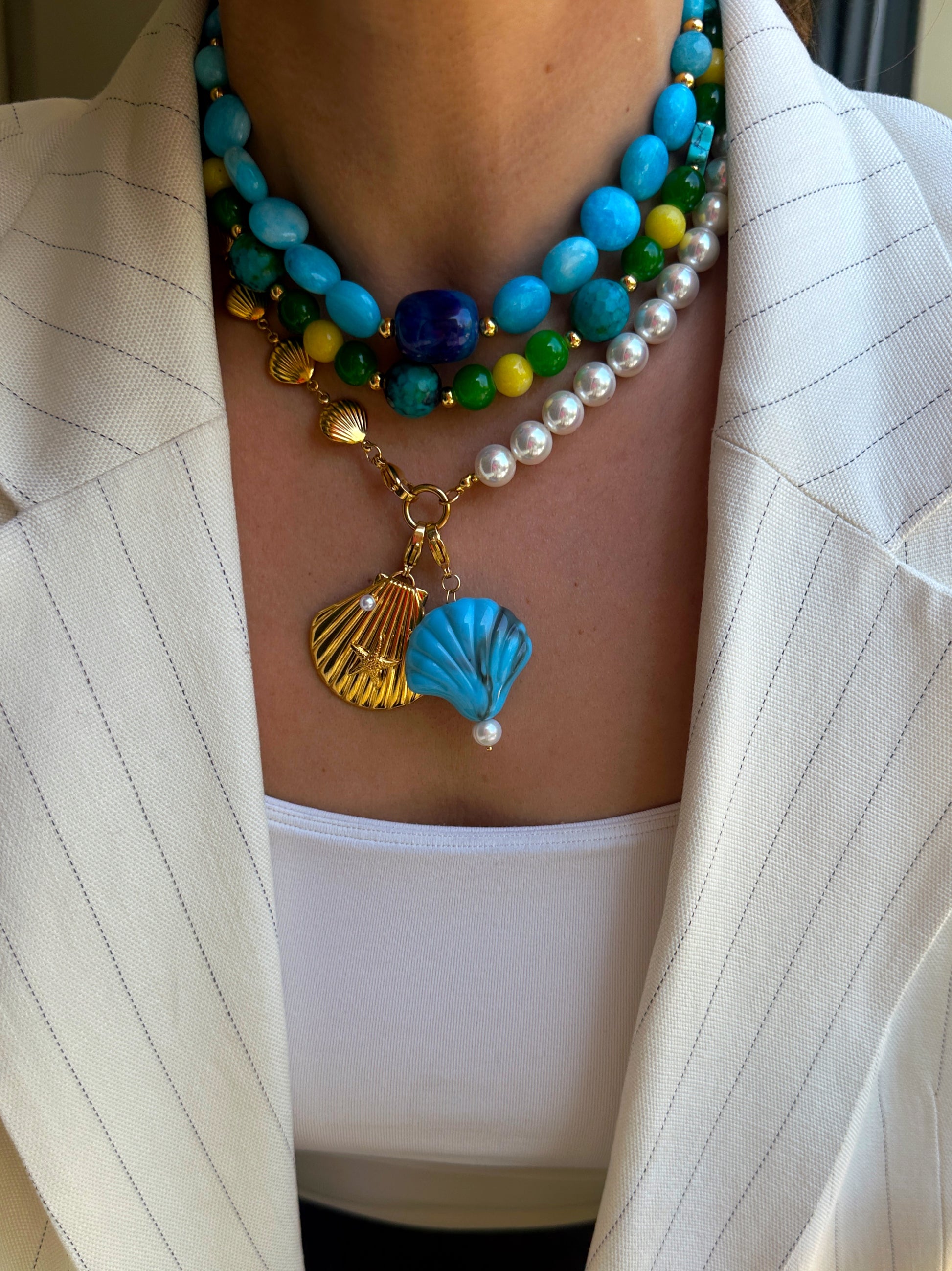 - Materiales: piedra natural: turquesas, calcedonias, vidrio, acero inoxidable chapado en oro 18k.
