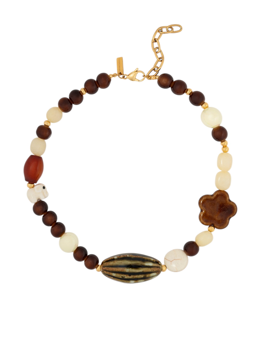 - Materiales: Acero inoxidable chapado en oro 18k, piedra natural, cristal pintado y cerámica.
